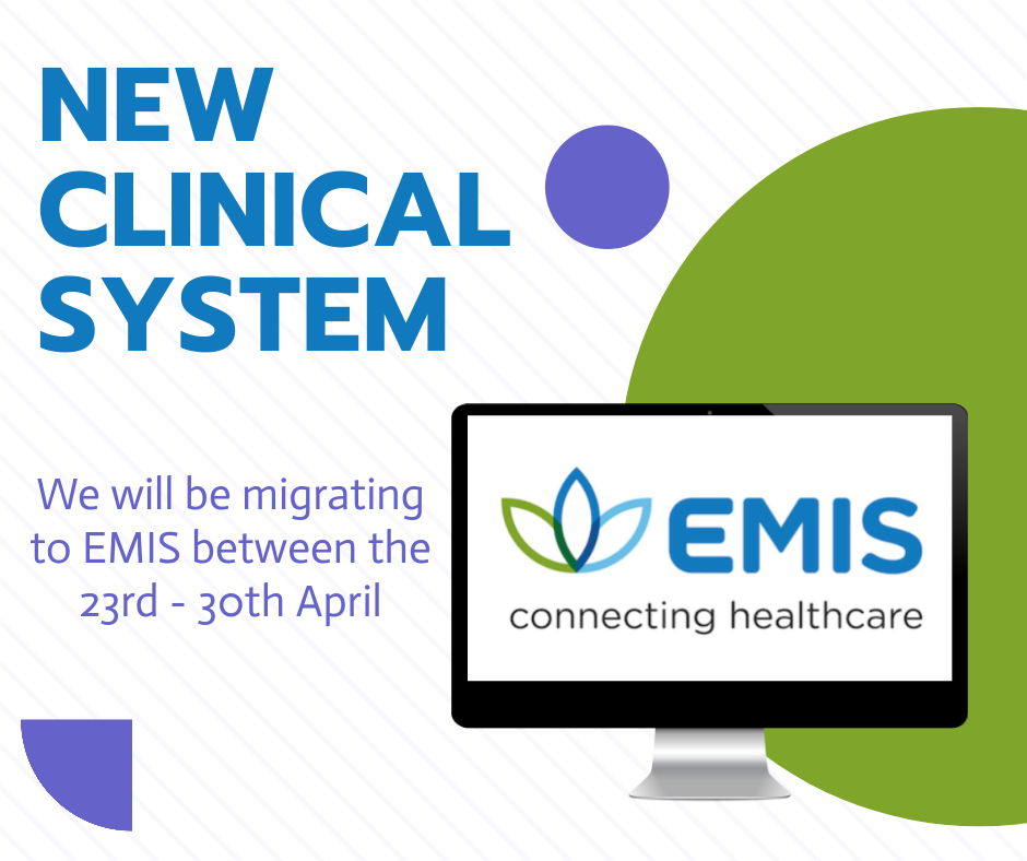 We would like to inform our patients that the practice will be migrating over to a new clinical IT system called EMIS between 23rd – 30th April 2025. While we are working to keep any disruption to a minimum for our patients, it may take slightly longer to process your requests during this time.